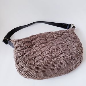 The Sak Elliott Lucca light brown knit small shoulder bag with top zipper closure, brown lining with multiple pockets and key finder. Gently used and in good clean condition and comes from a smoke free home. The bag is a soft and not structured and was stuffed with paper for a few pics. Y2k retro casual comfort soft crochet summer style.