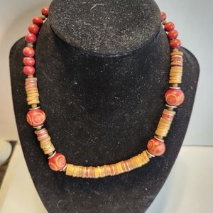 17" Wooden necklace with little round disc for larger balls of wood and then smaller little balls of wood closer to the clasp very neat