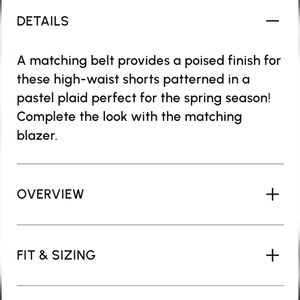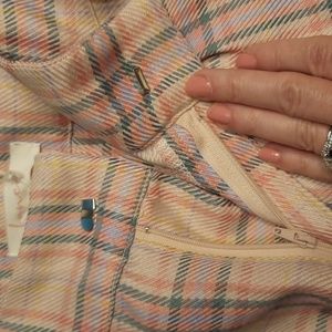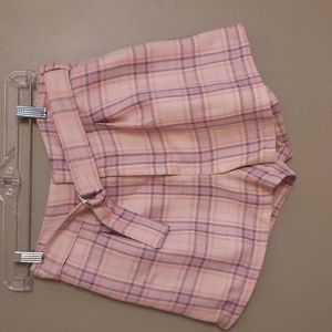 These are so cute!! pink plaid 2.5" inseam shorts with pockets, front zip and removeable belt. Perfect for fall. waist 14", I think these run small, no stretch in waist.