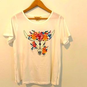 Ultra soft white tee with screen printed design finished with colorful hand embroidery. This boutique brand has limited runs of their designs so don’t miss out!