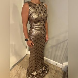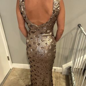 A never worn beauty, with a form fitting bodice and open back. This gown can be accessorized with colorful touches or taken as is with a bold red lip. Sequined with a color changing effect, going from matte taupe to shimmery grey depending on lighting. The model is 5’ and the length extends quite a bit with heels on. True to a size XS or 0. Feel free message me for more details.