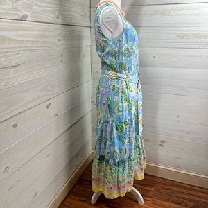 Lightweight 100% cotton non stretch fabric. Floral and paisley pastel print throughout. Colors include yellow, pink, light blue, pale blue, olive and white. Rounded neck. Sleeveless. Bust darts. Back toggle zip and hook/loop closure. Stitched in waist with threaded belt loops and matching fabric tie belt. Broomstick tiered skirt area. Fully lined in light blue 100% cotton fabric with attached slip. So sweet!