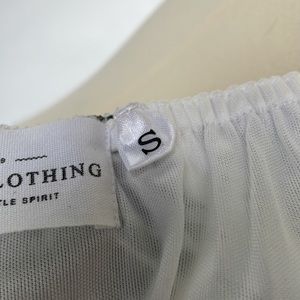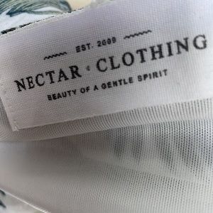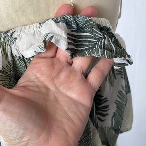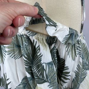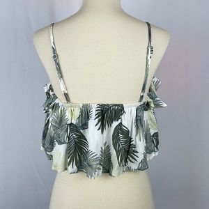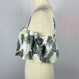 Super cute! Cream with tropical green palm leaves ruffle crop top from Nectar Clothing. Adjustable straps, with elastic off shoulder pieces. Elastic across top, attached shelf bra underneath. Beach, summer, vacation, Hawaiian. Size Small.