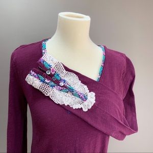 Anthropologie brand Little Yellow Button purple crochet ladies long sleeve knit top shirt, women’s size medium. V-neck with a contrast floral print, embroidered blue stitching, button detail, and crocheted lace embellishment at the cuffs. Unstretched bust measures 17 inches across, length 25 inches, sleeve 25 inches. Preloved good condition.