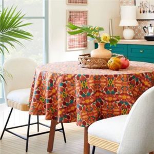 Beautifully style your table for the fall season with the 70-Inch Cotton Calling In the Abundance Round Tablecloth from Opalhouse™ designed with Jungalow™. This round tablecloth showcases a mix of berries and geometric patterns in red, green and blue hues for a colorful look that suits both your everyday and special occasion setup, and makes a perfect pick to enhance your dining experience, whether you're alone or with guests or family. Made from 100% cotton, this colorful tablecloth is machine washable for easy cleaning.