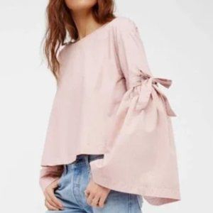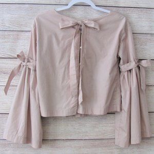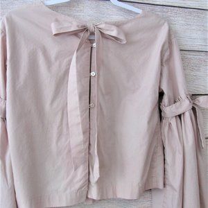 Buttons down the back with attached top tie, attached sleeve ties goes thru 2 loops on the ruffled bell sleeves. Color is Ballet Pink