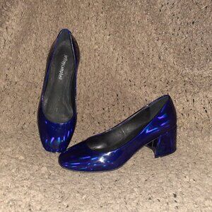 They are a nude/beige soft suede with 4.25" stiletto heels on a .5" platform.
