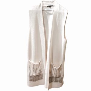 NWOT Kobi Halperin Ashton Beaded Fringe Sweater Vest. Size Large. Open Front. Sleeveless. Ribbed Knit Patch Pockets At Hips. Beaded Embroidery And Fringe At Pockets. Straight Hem With Side Slits. 47% Wool 47% Acrylic 5% Nylon 1% Spandex. No Crystals Missing. This Is Not Pure White. It Is A Few Shades Darker Then White
