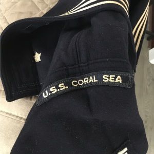 2 vintage us navy dress blue jumpers from the uss coral sea, one very rare with dragon liberty cuffs, one is 3rd class petty officer and one 2nd class petty officer, very good condition for their age, no holes or tears. Naval history. Military. Dress blues. Vintage military.