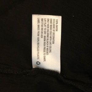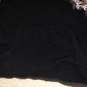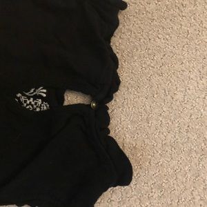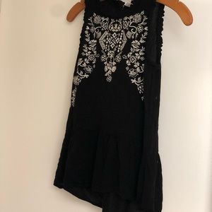 Black sleeveless top with white embroidery. Small ruffles on armholes and neck openings. Size XS, 15” pit to pit, 21” length, including 6” ruffle hem. Button hole closing in back. 100% rayon (not including embroidery).