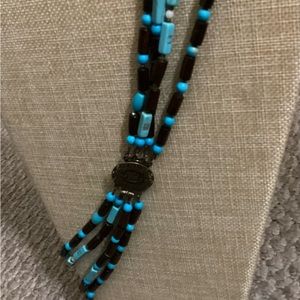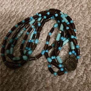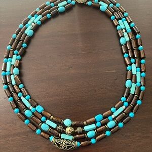 Add a touch of western style to your outfit with this beautiful handcrafted necklace.The necklace features four rows of Turquoise and brown wood beads, with a slide closure at the center.The pendant is none, and the necklace is 22inches long.