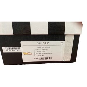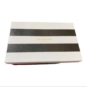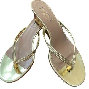Beautiful brand new Aquazurra wedge sandals. Rubber straps and a dazzling metallic finish add glamour and luxury to these wedge heel leather thongs. Slip on with leather soles, made in Italy. Wedge is 1.75”. Size EU 40. Some faint scratches near base of inner sole - see pictures, won’t be seen when worn. Includes box and dust bag. Perfect shoe for holiday season!