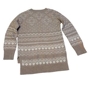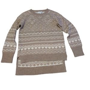 Size small high low hem tan fair isle sweater. Stained near back of right wrist.
