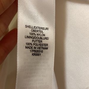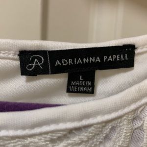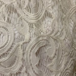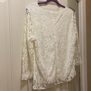 Adrianna Papell White Lace, Sheer 3/4 length sleeve, White underlay, Size L. 1/4 zip in back with hook and eye. Style: 17PB20310. Exterior Shell: 100% Nylon. Lining: 100% Polyester. Hand wash cold and lay flat to dry. Gently worn.