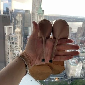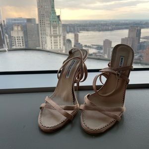 Light beige strappy Manolo Blahnik Heeled Sandal with Scalloped Insole Detail. Good condition, straps in tact with light wear visible on scallop edged insole. Some browning/visible wear on outsole. Perfect for spring/summer events. Comes with dustbag.