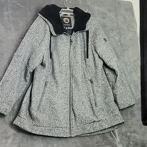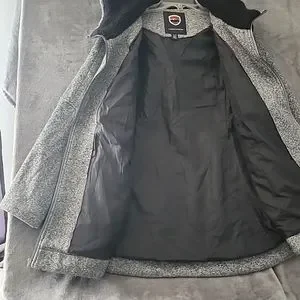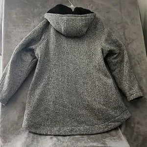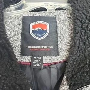 Women's 1 Madison Expedition Jacket, Heritage Collection. Size XL. Like New . Fully Lined, zipped pockets in front Lined with velvet. Hood is lined with sherpa for extra warmth. Metal branding on the left sleeve. Rounded hem. 60% cotton 40% polyester, lining 100% polyester. Grey/black knit outer material. #women's #jacket #hoodie