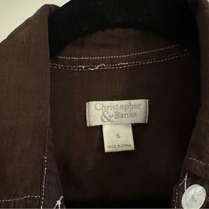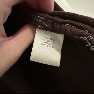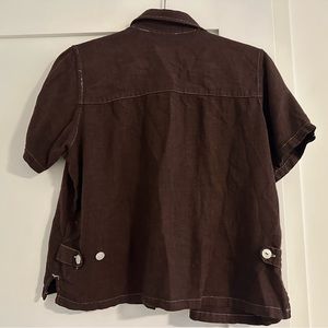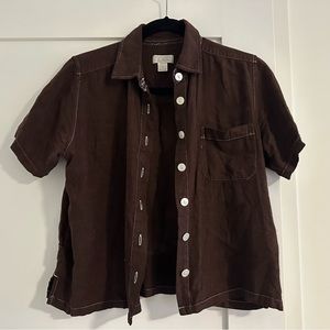 Super soft and comfy short sleeve button up shirt. Linen/rayon blend. Washed and worn a few times but in great shape. Some loose threads here and there but no damage.