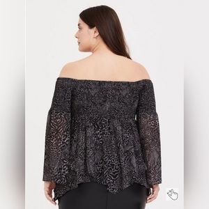 Torrid Babydoll Chiffon Smocked Off-Shoulder Top Animal Print Black Grey Size 5