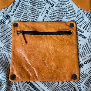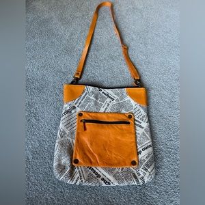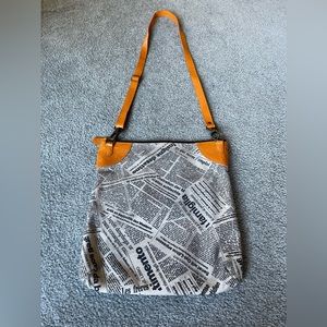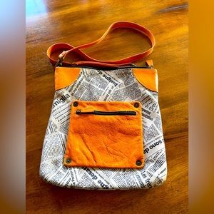 Maurizio Taiuti Italian leather crossbody newspaper print bag, unique coated suede newspaper print, orange leather accents with orange strap, zip front pocket, zip top closure, zip inside pocket, phone pocket inside newspaper print, purse is 12x11 with a 52” adjustable strap,like new very gently used.