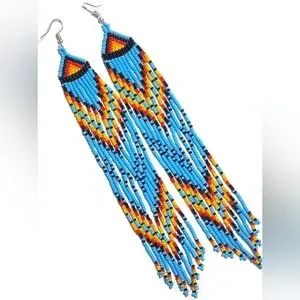 Long 7.5" Turquoise Blue Beaded Fringe Dangle Earrings Native American Style New