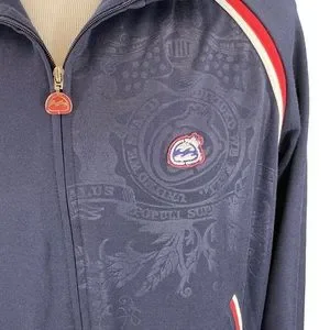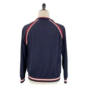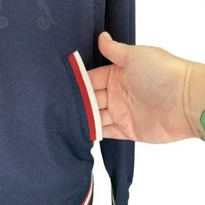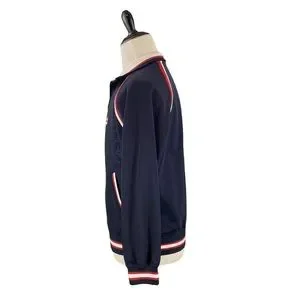Features: Navy, Red/White Accent Stripes, Medium Weight, Warm, Casual, Classic, Trendy, Sporty, Athletic, Embroidered Logo, Long Sleeve, Side Pockets, Zip Up, Track, Jacket