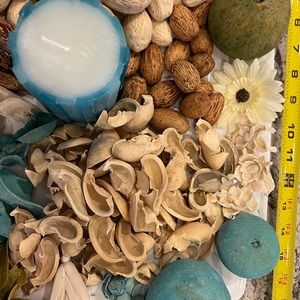 Vase and bowl filler and candle. Natural earthy, brown, beige, tan, green and teal/blue pieces, along with teal/blue/white candle, paper flowers and various balls.