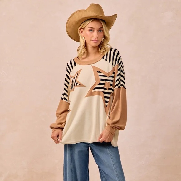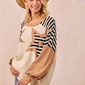 New star patchwork top from Bibi in an oversized S. No size tag as this was sold as a sample piece. Retails for $65-$100 in most boutiques.