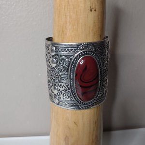 6.5 Inch Silver Tone And Dark Red Cuff Bracelet