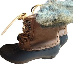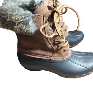 6.5 Sperry black boots They are in great condition. Our shoes are preloved and so they may have little ware. Please check out the pictures. no rips stains tares or holes. In a smoke free and pet free home. very comfortable shoes. Same day or next day shipping.**don't hasitate to make an offer***