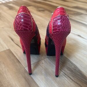 Gorgeous and glam peeptoe pumps grabbing glances with chic faux suede and reptile-embossed upper, plus high stiletto heels. Slim buckle-strap closure.