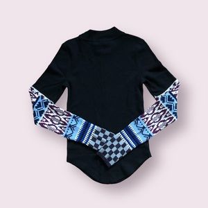 This top by We The Free from Free People features a ribbed knit fabrication, defined seaming, thumbhole details, mock neck silhouette, fitted design, and contrast knit sleeve detailing.