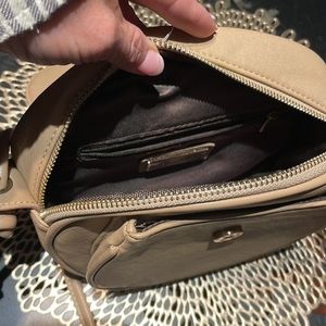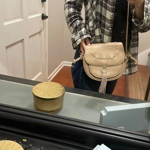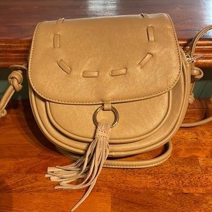 Lionel Designer Crossbody purse with fringe accent in camel color
