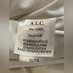 New with tags A.L.C. faux fur coat in the size XL. Faux leather hood and pulleys. Front bottom pockets. Toggle and button front closure.
