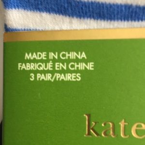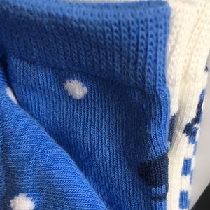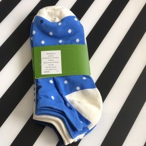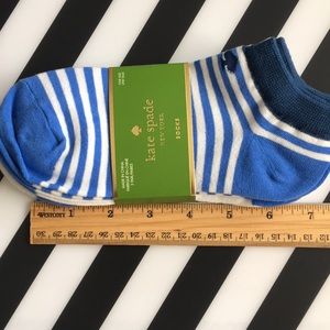 Kate Spade socks. Three pack front of package says one size and sticker on back shows 9-11. Picture taken with ruler for you to decide. Please no returns. New never removed from green wrap around. One pair polka dot and one pair striped and other pair white with blue toes and heel.