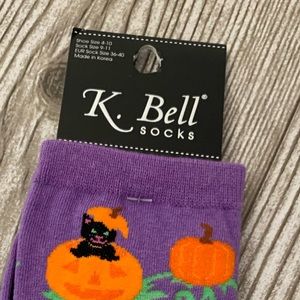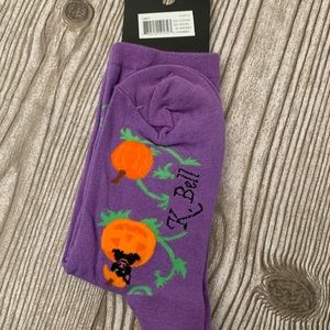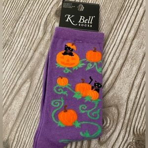 Women’s purple crew socks with cats and pumpkins. Size 4-10.