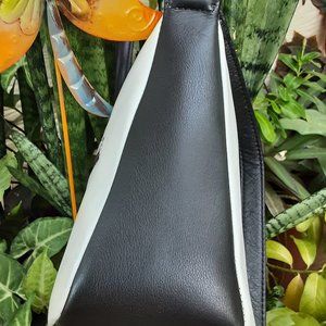 This is a never used handbag by ili New York leather. It is black and white, has an outer zippered pocket. There are two stationary circular leather handles, and it comes with a removable black leather strap so that it can also be used as a shoulder bag or crossbody. The interior is red with one zippered compartment and 2 open pockets. This style is retired, however it has never been used and still has the tag attached.