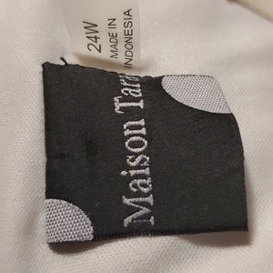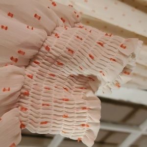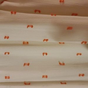 This dress is darling! Its a Plus-sized fully lined, drop waist, tiered dress! V-neck, simple one clasp at neck back. Its cream colored or maybe more of an egg shell color with orange raised detailed throughout! The arms are sheer with elastic at the wrists!
