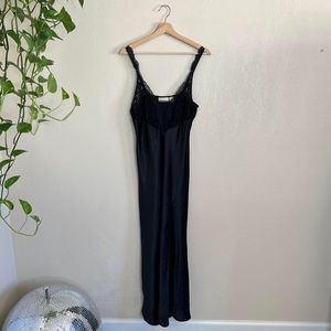 Features lace bodice with mesh material, adjustable straps and front slit. Model is wearing a bra in photo, bodice is a sheer lace.