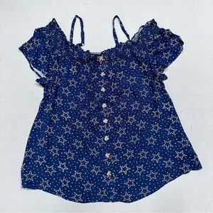 Torrid 17614993 Rayon Crepe Smocked Cold Shoulder Top, navy blue with white star cluster print, women’s plus size 1, 1X, 14–16. Retails $50! Smocking around the top with adjustable straps, buttons down the front, loose and flowy. Brand new with tags perfect condition! 17614990