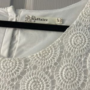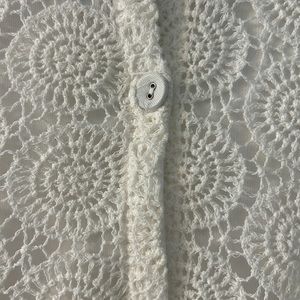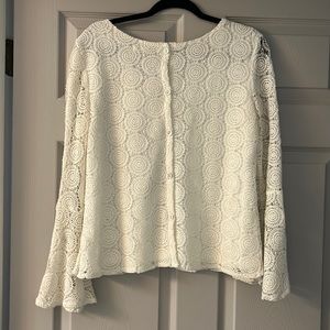 Lined. Worn once or twice. Scoop neck. Sheer sleeves. Bell sleeves. Button down back. Crochet overlay. 23” from shoulders to hem. 18” from pit to pit.