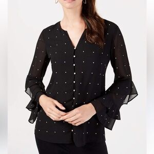 The blazer features notch lapels with decorative detail all the way to the hem, button down closure, long sleeve and long side and back see through lace panels. Unlined.