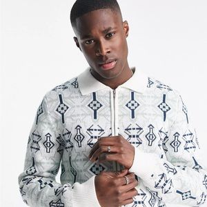 Topman geometric knitted zip through polo in ecru and blue