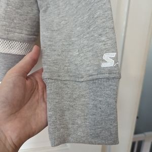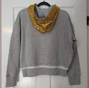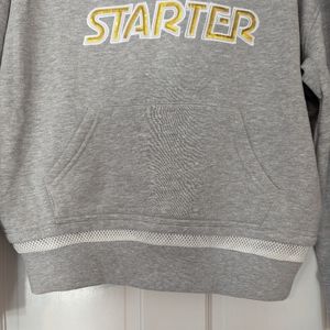 Starter logo shirt with gold sequins letters and hood. Great used condition. Some signs of wear on the front of sweatshirt but not noticeable in photos. Inside is soft and like new.