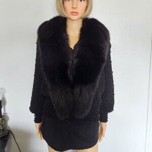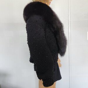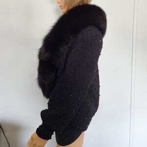 Unbranded black knit sweater/ big, beautiful detachable black fox fur collar, black plastic beads throughout, approximately medium by measurement. Measurements are arm pit to pit 21", shoulders 18", sleeves 23" and length 24".