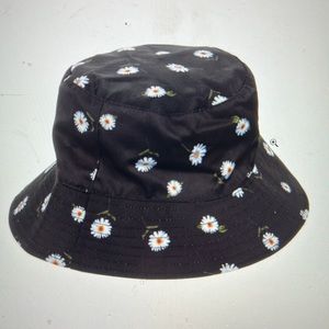 Black and white cotton with floral pant print pattern on one side and when reversed white bucket hat