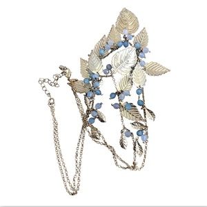 Cute necklace with gold tone leaves and delicate blue beads. It’s marked, but too small for me to read.