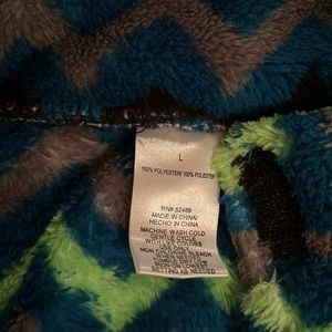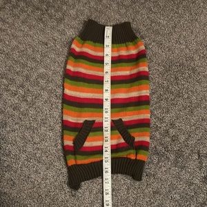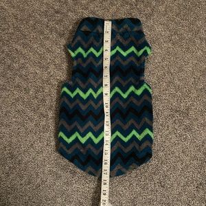 Bundle of two dog sweaters. See pictures for measurements. Both size large. Blue zig zag design has Velcro. Striped sweater is pull over. Laundered and very clean. No stains. EUC