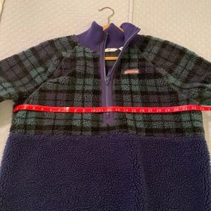 This top from Vineyard Vines is a combo of Black Watch plaid and solid navy. It’s is a size medium but it runs very large. See photos for measurements with a tape measure. I am a size 14, large, and this is big on me! The colors are not well represented in the photos. The neck and cuffs are a dark navy blue, not purplish! The plaid is dark green and dark blue. It was barely worn so it is in excellent, like new condition.