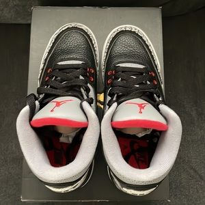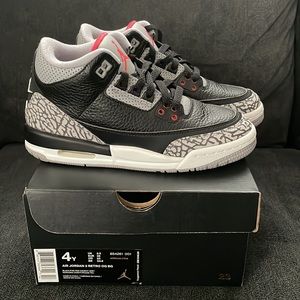 Black Cement 2018 GS (grade school) size 4. OG Nike Air branding on heel panel. Condition is almost new, they were worn once for a photo shoot. There is some very faint creasing, as seen in photos. Come with original box.