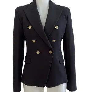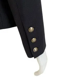 The double-breasted front is accentuated by signature gold buttons and a notched lapel frames the neckline beautifully.